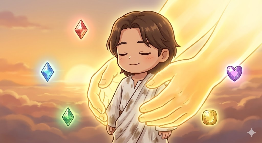 구원받은 자: "저는 자격이 없습니다. 하지만 예수님이 저를 위해 죽으셨고, 제가 그분의 옷을 입고 있기 때문입니다." (예수의 공로)