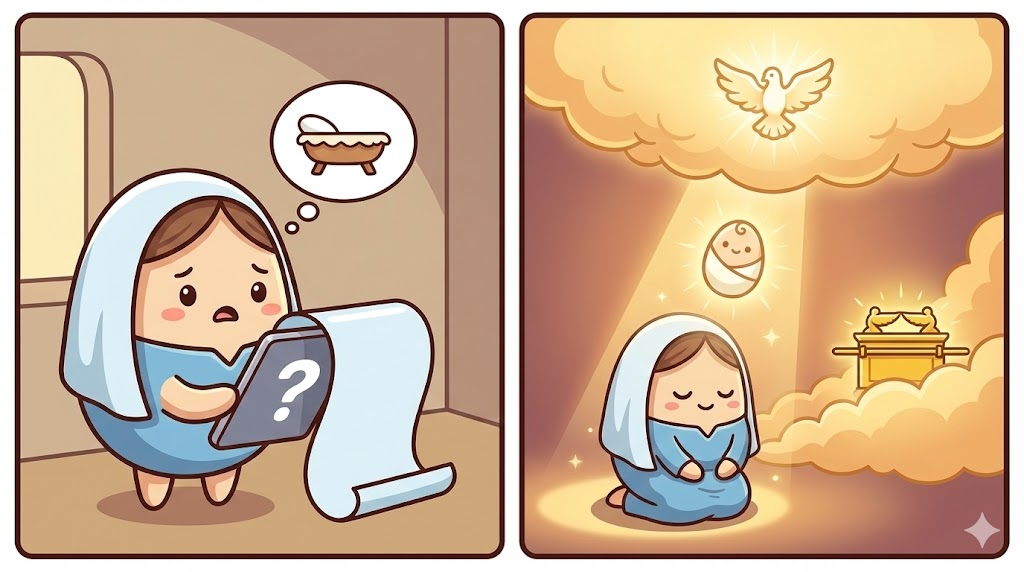 천사 가브리엘은 생물학적 설명 대신, 놀라운 신학적 비밀을 선포합니다.