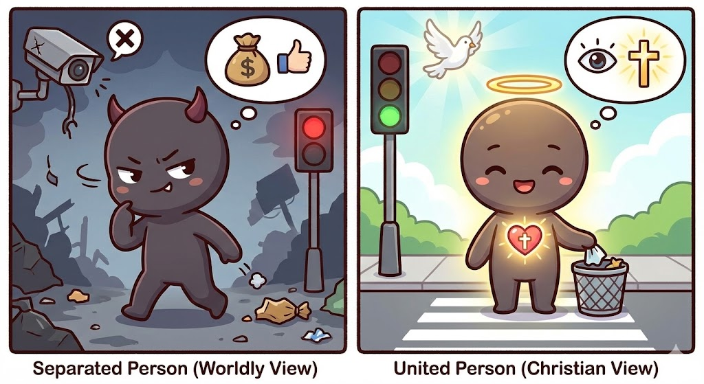 연합된 자: "아무도 안 봐도 지켜야지." (내 안에 하나님이 계시니까)
