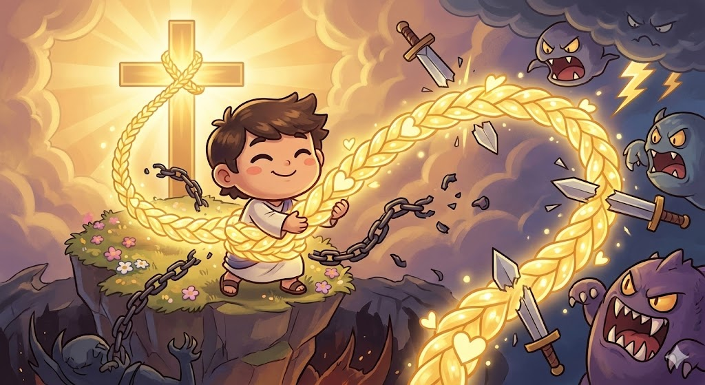 예수님이 십자가로 묶어놓은 '사랑의 밧줄'이 너무 강력해서, 세상의 그 어떤 칼로도 이 줄을 끊을 수 없다는 뜻입니다.