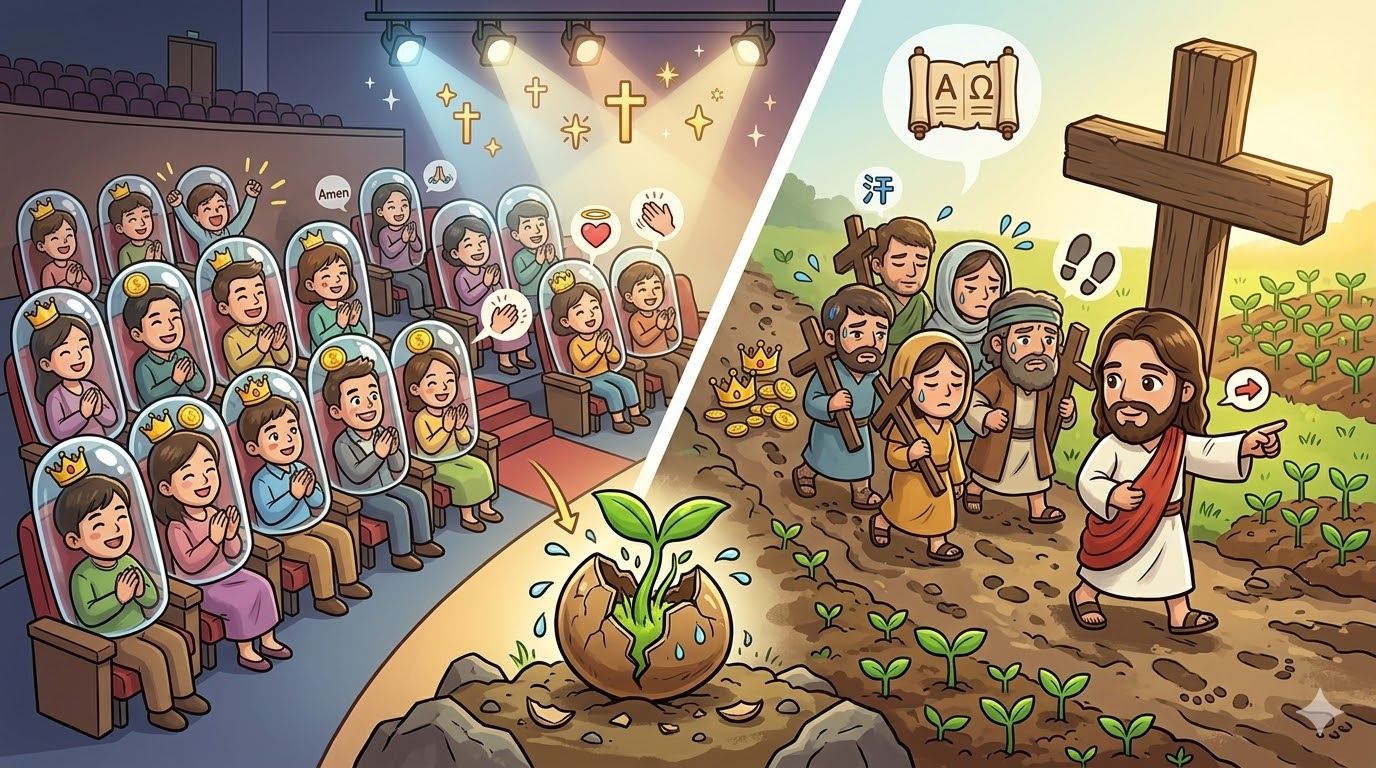 오늘 당신은 죽기를 거부하며 관중석에 앉아있는 단단한 밀알입니까, 아니면 예수님과 함께 흙바닥에 썩어짐으로 누군가를 살려내는 밀알입니까?