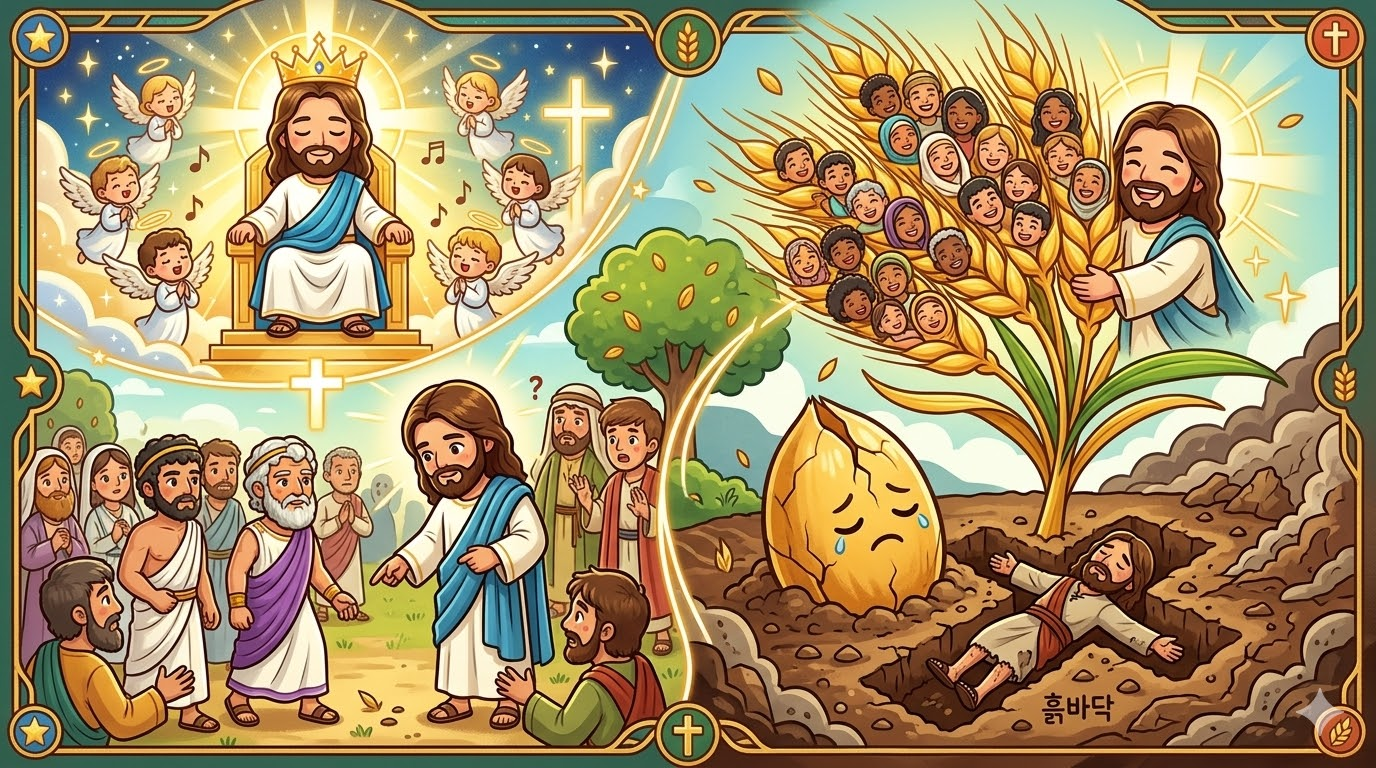 "한 알의 밀알이 땅에 떨어져 죽지 아니하면 한 알 그대로 있고 죽으면 많은 열매를 맺느니라(24절)." 창조주이신 주님은 흙바닥에 버려져 밟히고, 자신의 살갗(껍데기)이 처절하게 찢겨지고 썩어지는 그 지독한 죽음의 방식을 기꺼이 당신의 찬란한 영광으로 취하셨습니다.