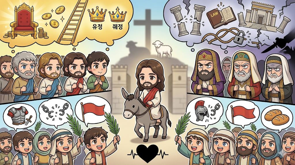 "주님, 예수님을 내 성공의 사다리로 삼으려 했던 제자들의 야망, 내 기득권을 지키려 했던 종교 지도자들의 두려움이 바로 내 안에 있음을 회개합니다. 오늘 나의 이 타락한 시선을 거두고, 나를 살리기 위해 묵묵히 나귀를 타신 주님의 그 긍휼의 시선 앞에 내 삶을 완전히 항복합니다."