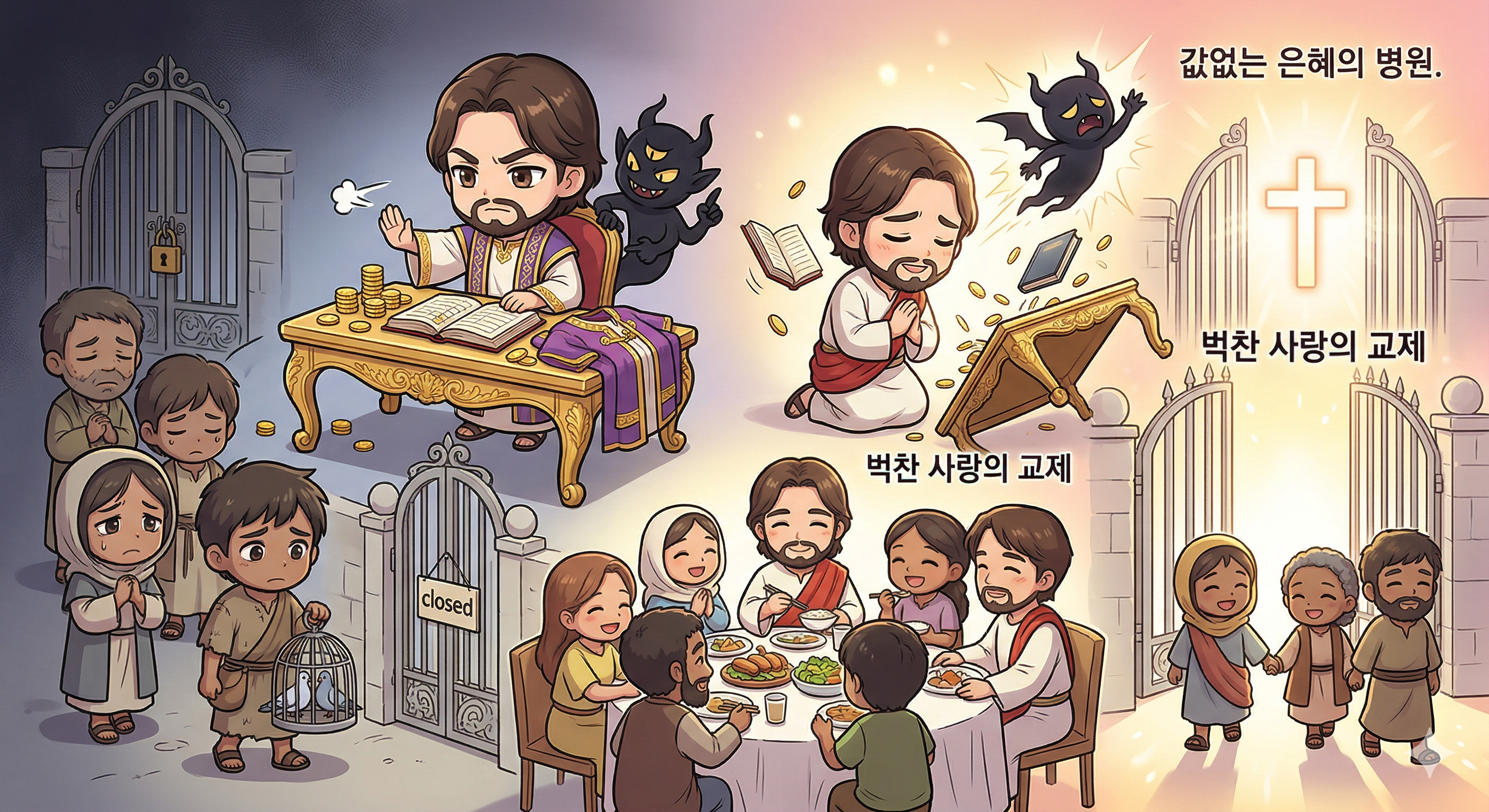 기독교는 내 투자로 축복을 얻어내고 우리끼리 성벽을 높이는 비즈니스가 아닙니다. 자격 없는 나를 위해 기꺼이 육체를 찢으사 생명의 문을 여신 십자가 앞에서, 내 이웃마저 그 열린 문으로 초대하는 벅찬 사랑의 교제입니다.