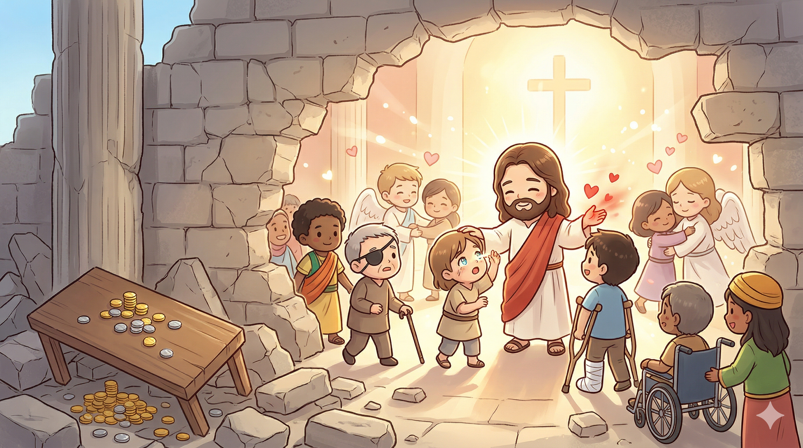 14절, 거래의 테이블이 엎어지자 "맹인과 저는 자들이 성전에서 예수께 나아오매 고쳐주시니"라고 성경은 증언합니다.