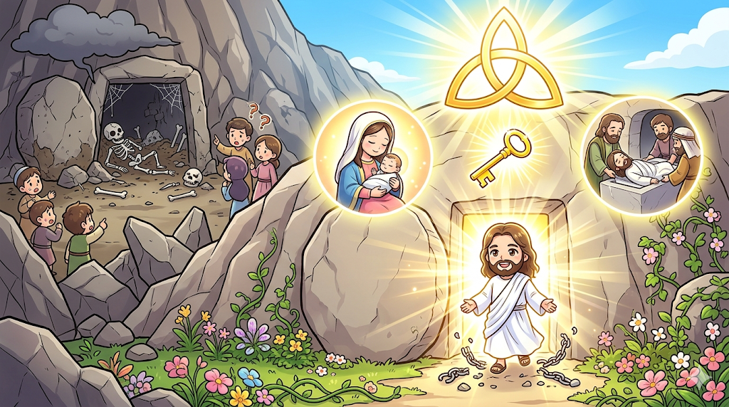 철저히 밀폐된 바위, 사망의 냄새가 단 한 번도 배지 않은 이 처녀 무덤은 오직 하나님을 위해 예비된 무대였습니다. 예수님이 성육신하실 때 남자를 알지 못하는 '처녀의 태'를 빌려 거룩하게 오셨듯, 부활하실 때도 오직 '처녀 무덤'에 묻히심으로 장차 터져 나올 부활이 오직 삼위일체 하나님의 독단적이고 절대적인 생명력임을 증명하신 것입니다.