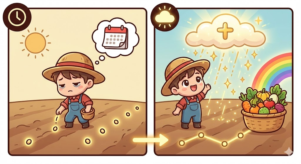 내가 오늘 찍은 인내의 점들이 모이고 모이면, 하나님이 카이로스의 비를 내리셔서 그것들을 '풍성한 추수(선)'로 연결해 주실 것을 믿는 것입니다.
