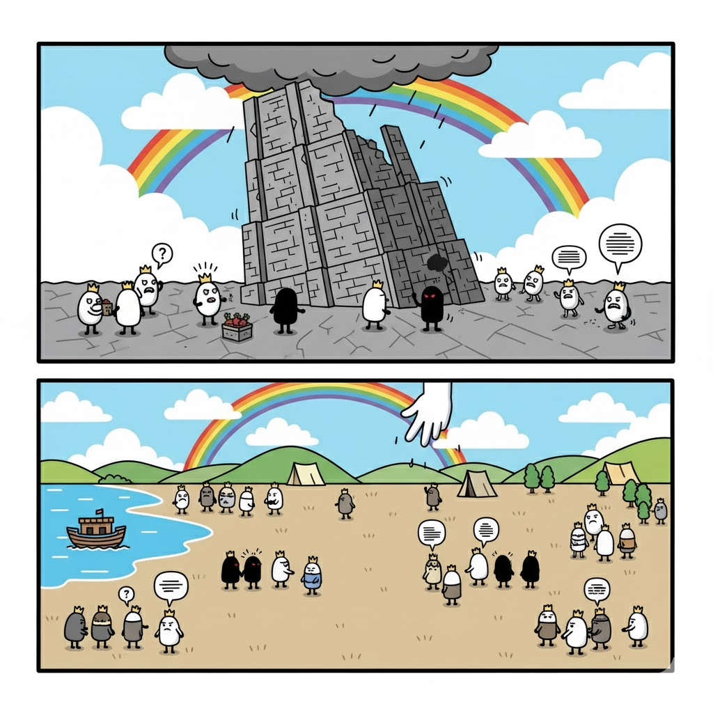 '하나님 없는 연합'은 더 큰 죄(홍수 직전)로 치닫는 '가속페달'이었기에, 하나님은 그들을 '흩으심'으로써 그 파멸을 막으십니다.