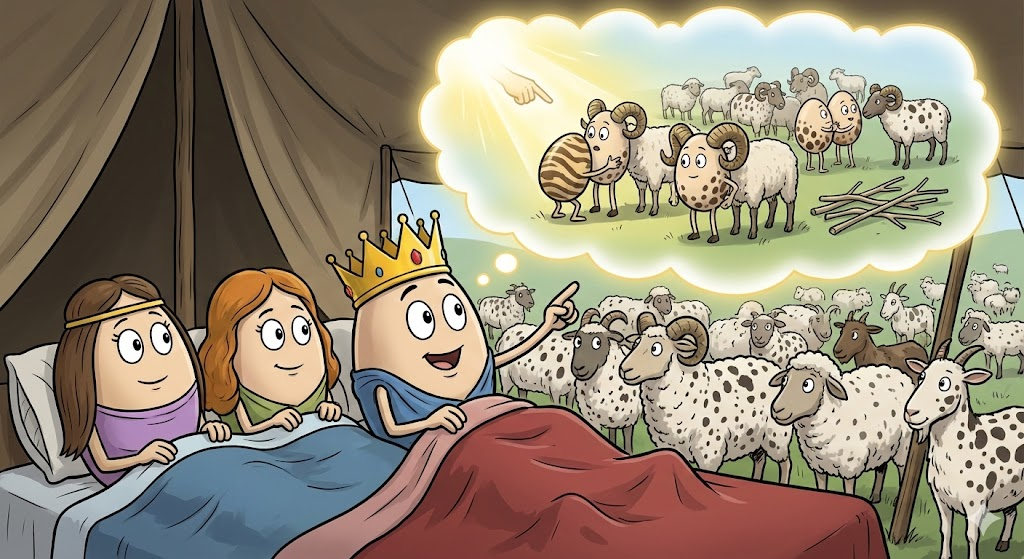 "야곱아, 네가 나뭇가지를 흔들어서 된 게 아니다. 내가 이미 '유전적으로' 얼룩무늬를 가진 숫양들이 교미하게 만들었다.