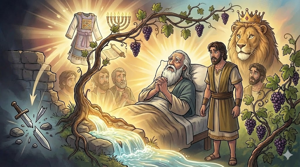 대신 열두 아들을 불러 모아 그들의 미래를 축복하고 예언합니다.