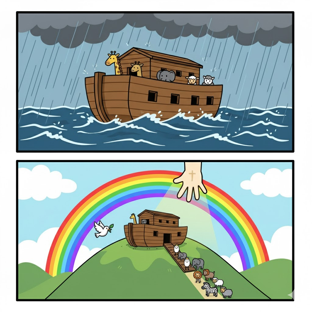 다음 이야기, "다시는 물로 심판하지 않겠다 : 무지개 언약과 '완벽한 경험' 직후에 무너진 노아 (창세기 9장)"에서 그 충격적인 반전과 은혜를 만나겠습니다.