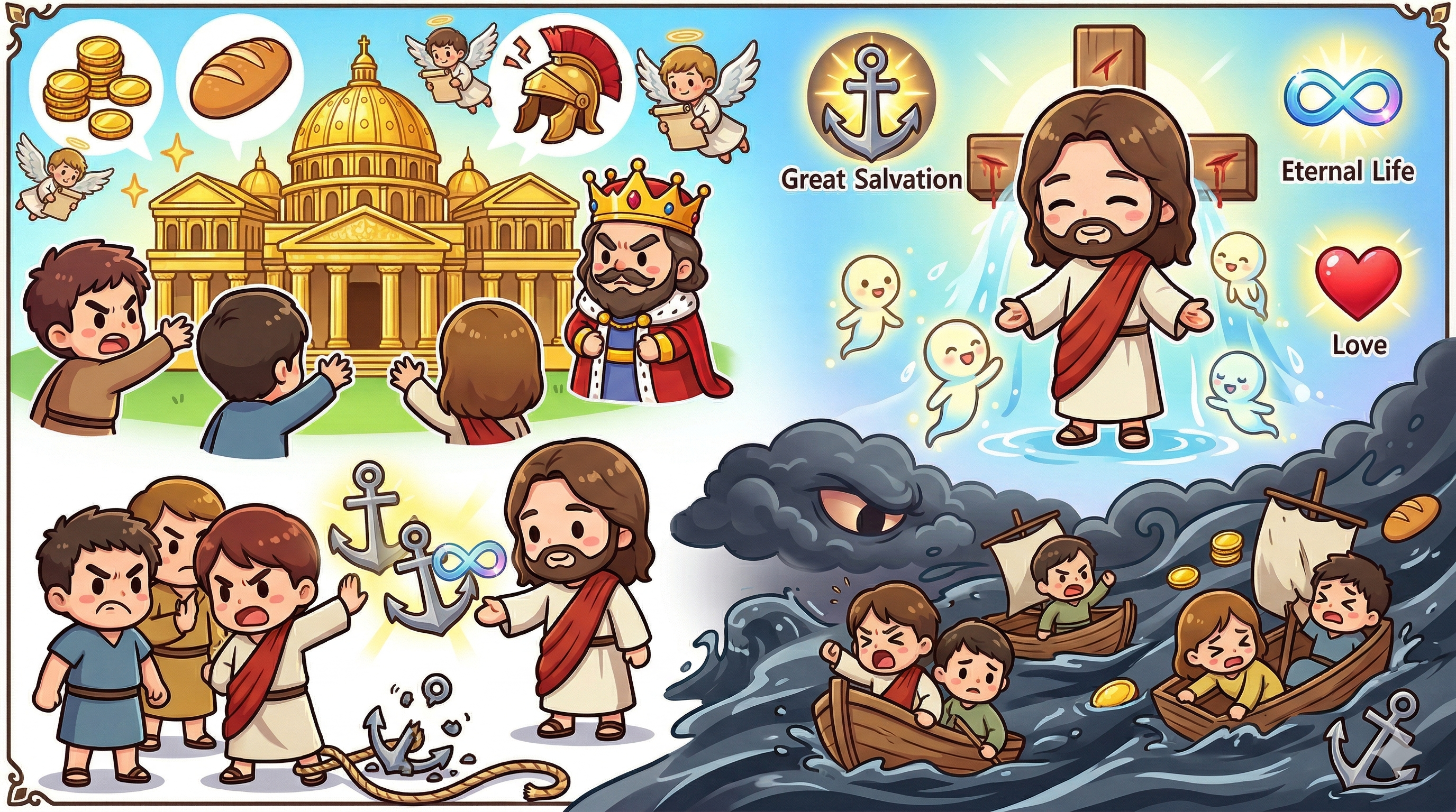 하나님 나라의 통치를 거부하고 세상의 욕망으로 떠내려가던 얄팍한 환호를 회개하고, 삼위일체 하나님이 완성하신 '큰 구원'에 영혼의 닻을 단단히 내려 표류하는 이웃의 손을 붙잡아주는 생명력을 나눕니다.