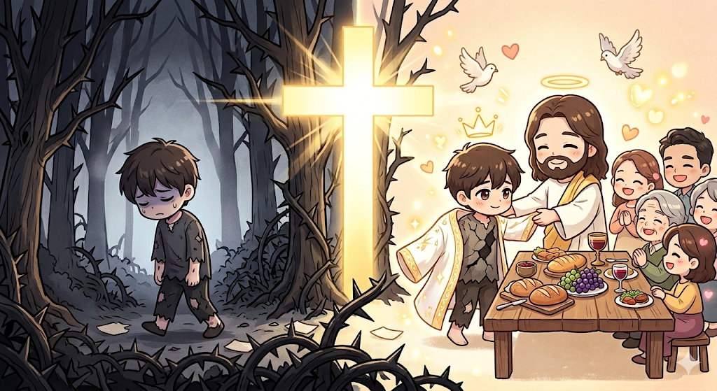 주님이 십자가를 참으신 이유는 단순히 법적인 죄 사함을 위해서만이 아니라, 우리를 '주님의 가족'으로 입양하시기 위한 처절한 사랑의 지불이었습니다.