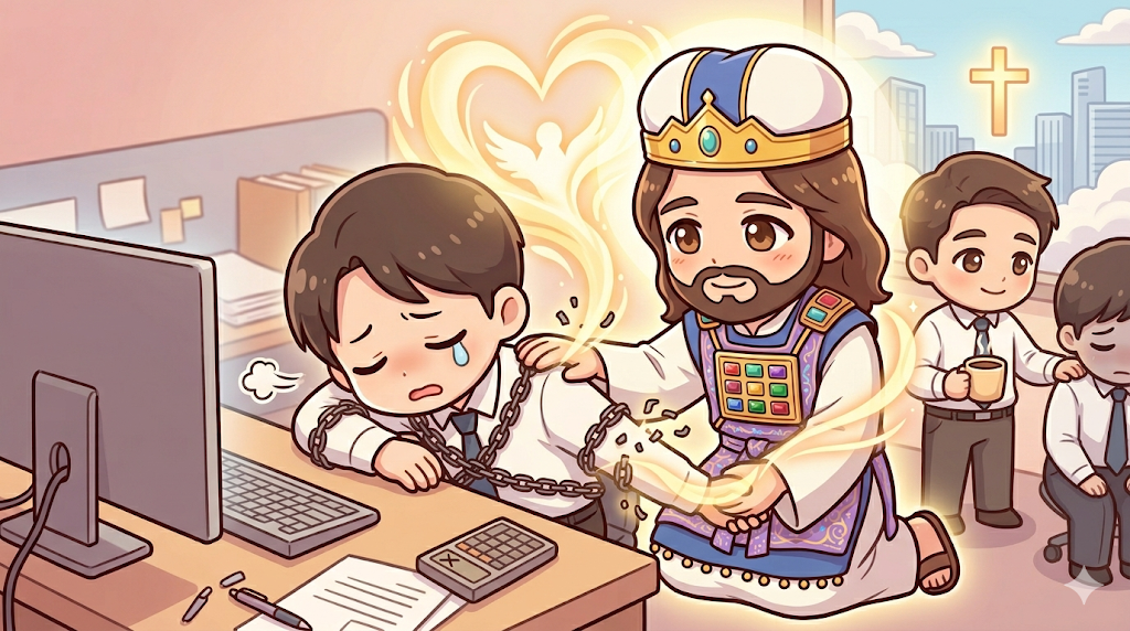 '주님, 평생 생존의 공포에 매여 세상의 노예로 살았던 나의 멱살을 풀어주심에 감사합니다. 나의 모든 아픔과 압박감을 체휼하시는 자비하고 신실한 대제사장 앞에서, 오늘 내가 쥐고 있던 생존의 계산기를 내려놓고 참된 안식을 누리게 하옵소서.'